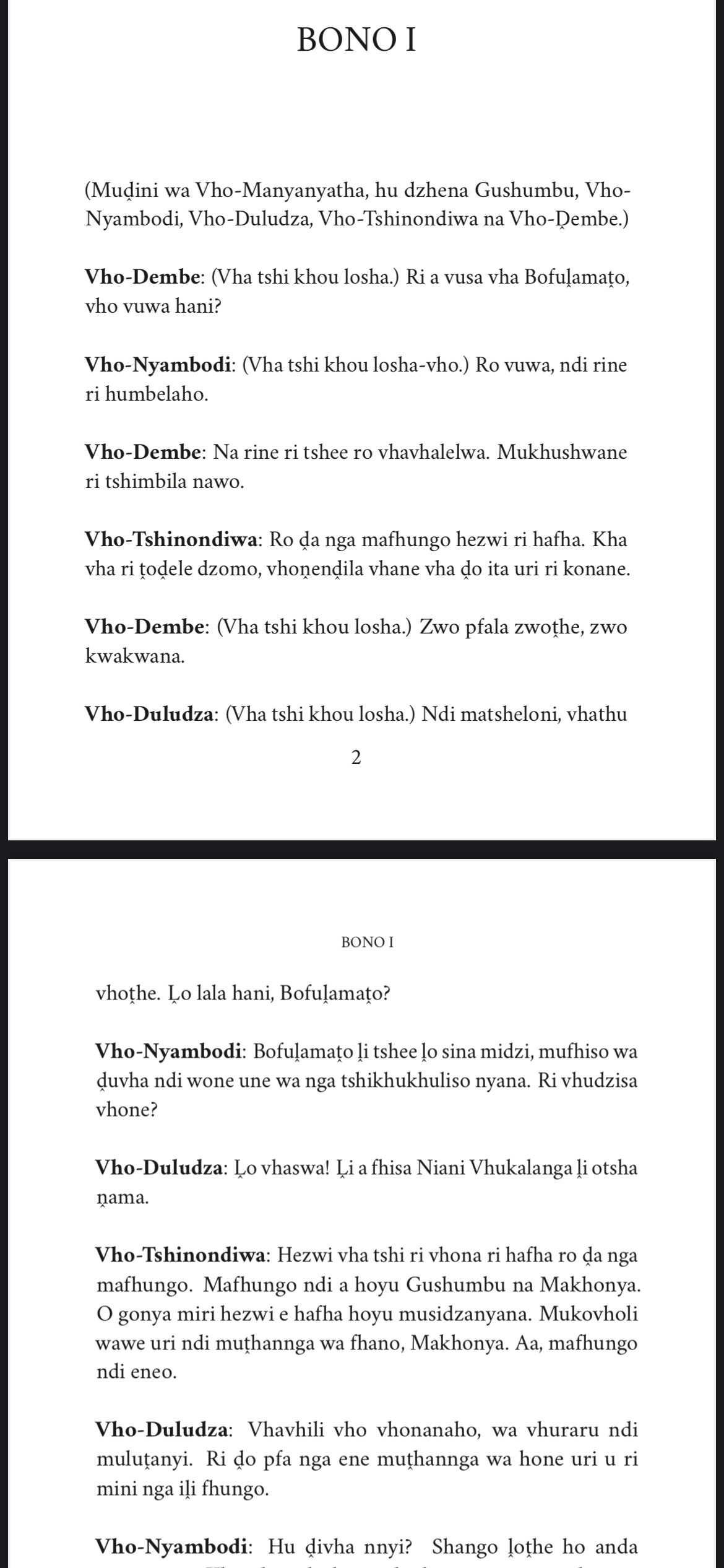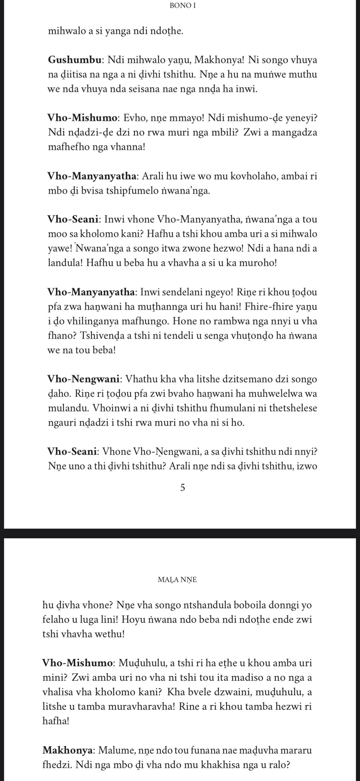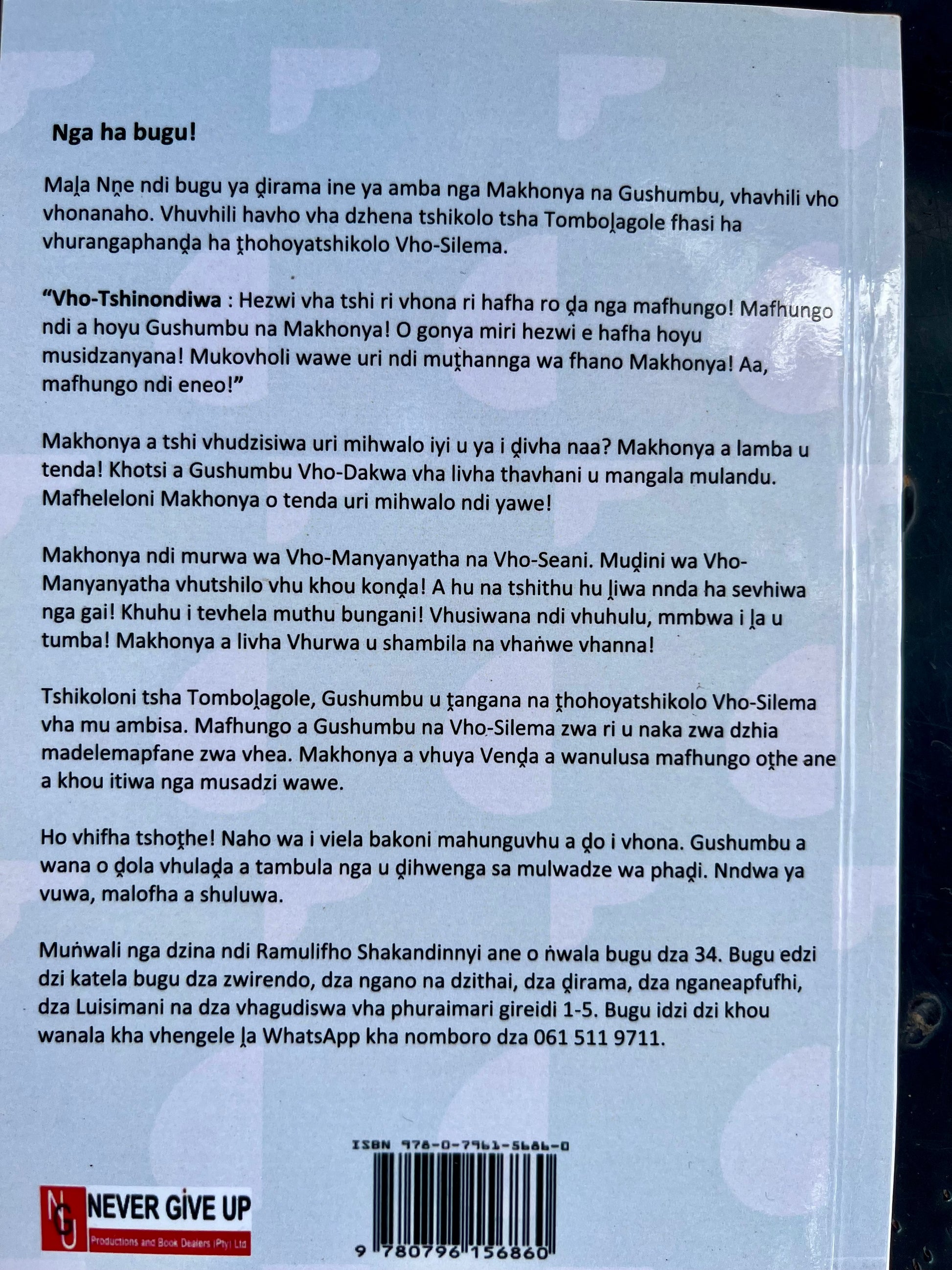 "Vho-Tshinondiwa: Hezwi vha tshi ri vhona ri hafa ro ḓa nga mafhungo! Mafhungo ndi a hoyu Gushumbu na Makhonya! O gonya miri hezwi e hafa hoyu musidzanyana! Mukovholi wawe uri ndi muṱhannga wa fhano Makhonya! Aa, mafhungo ndi eneo!"