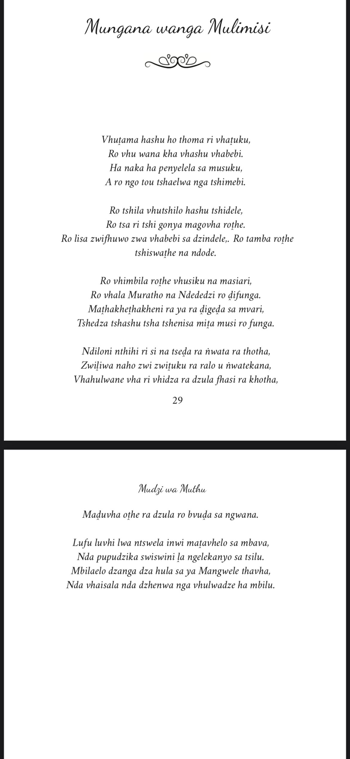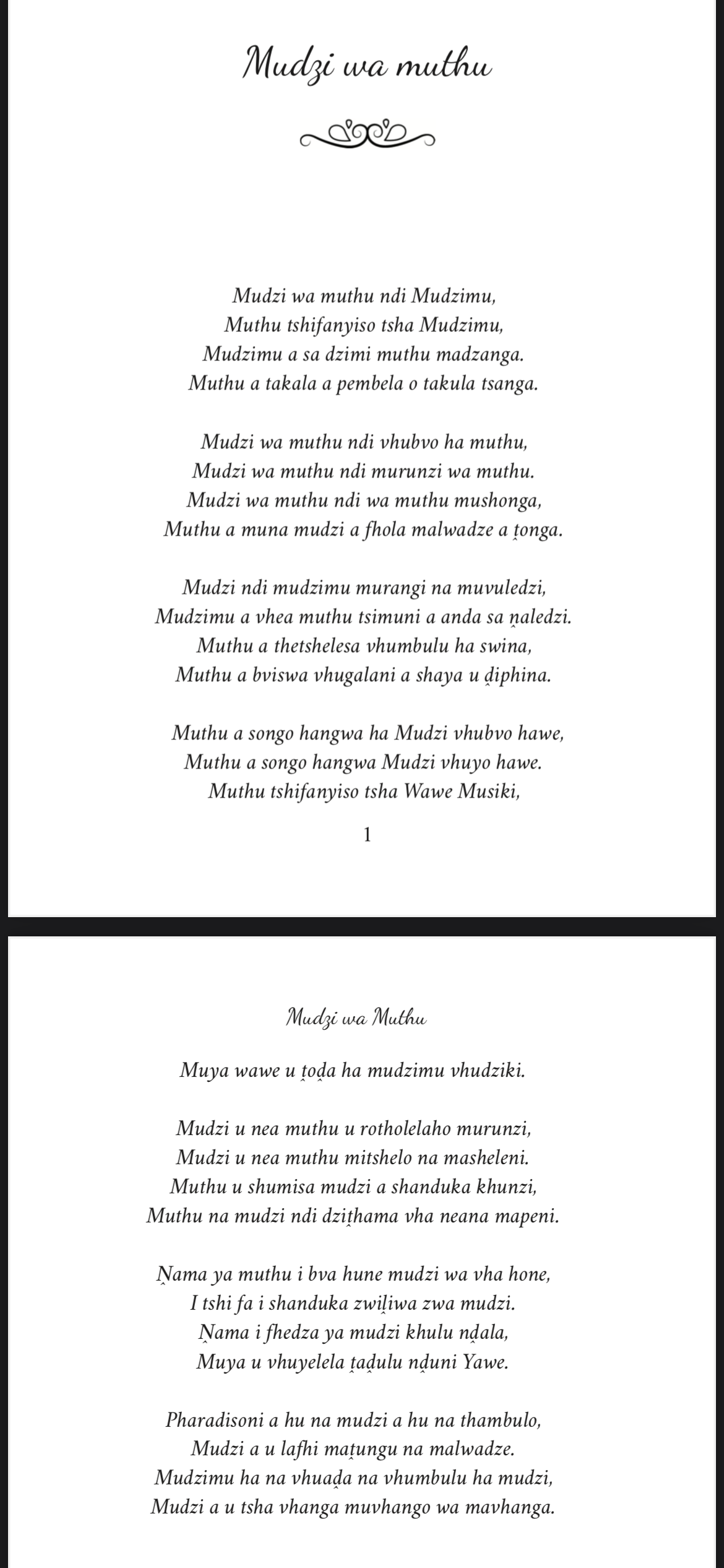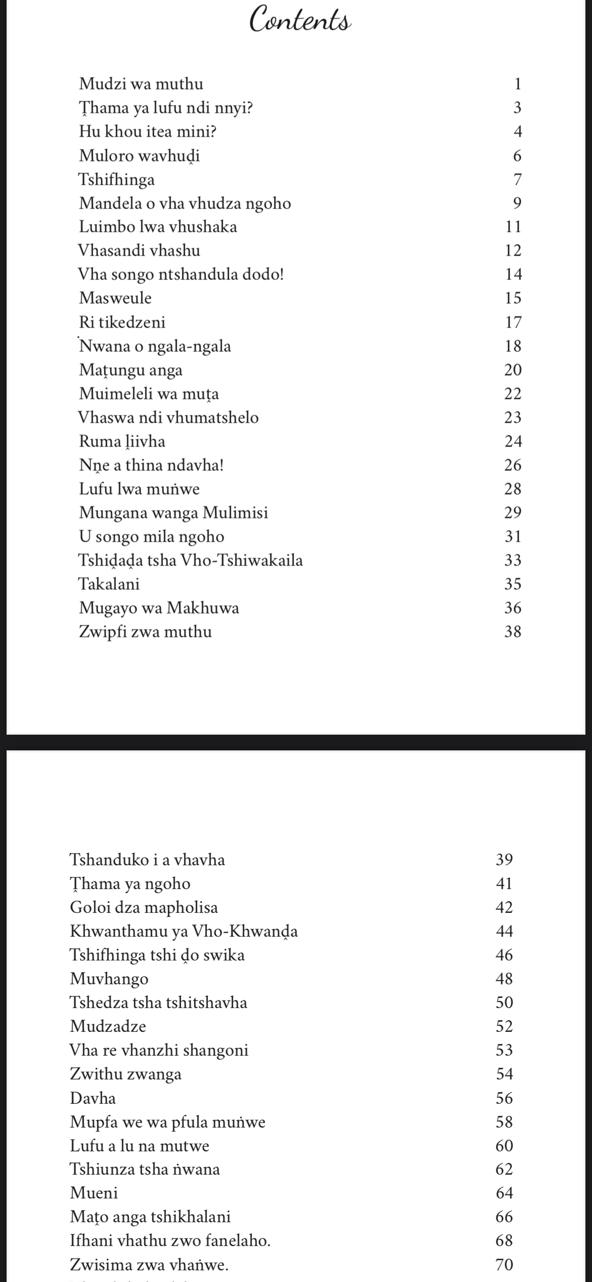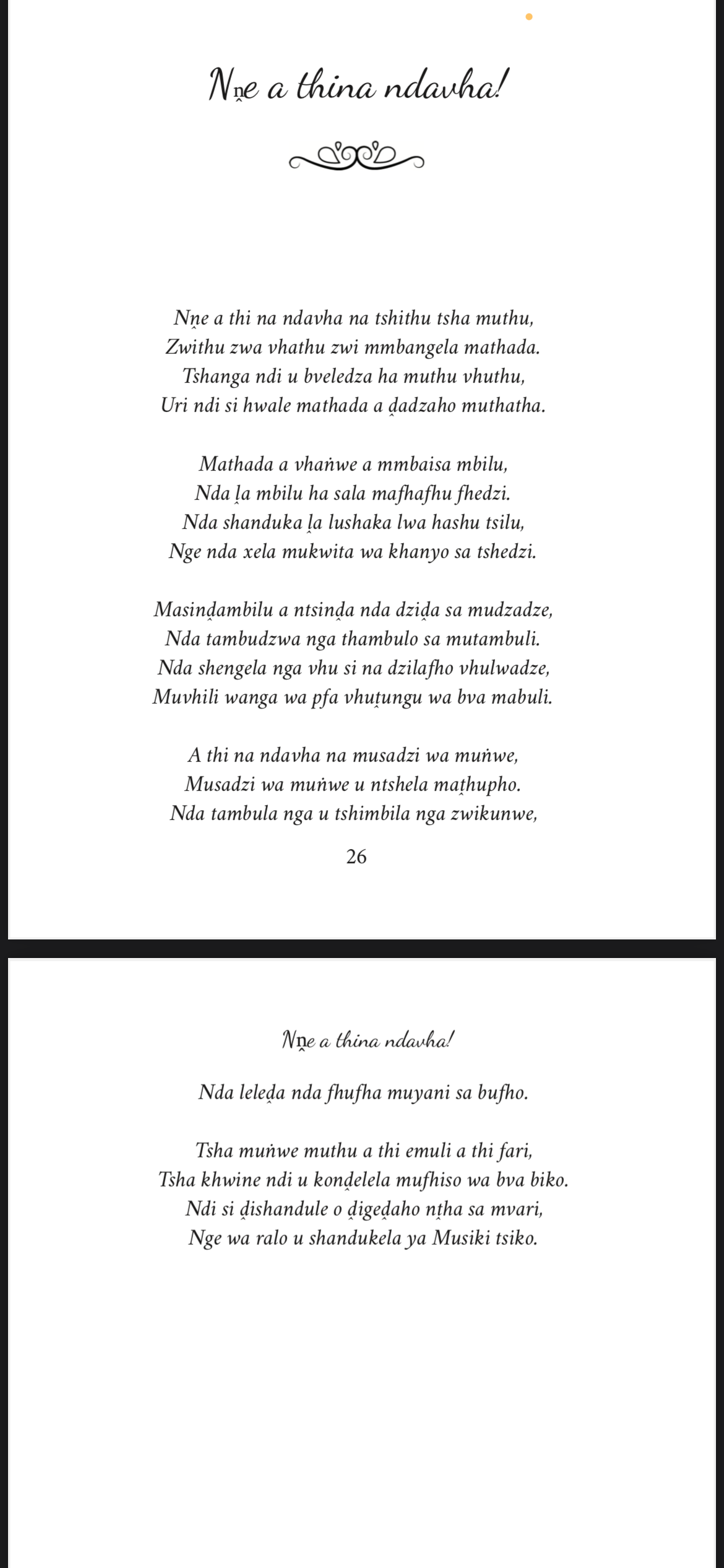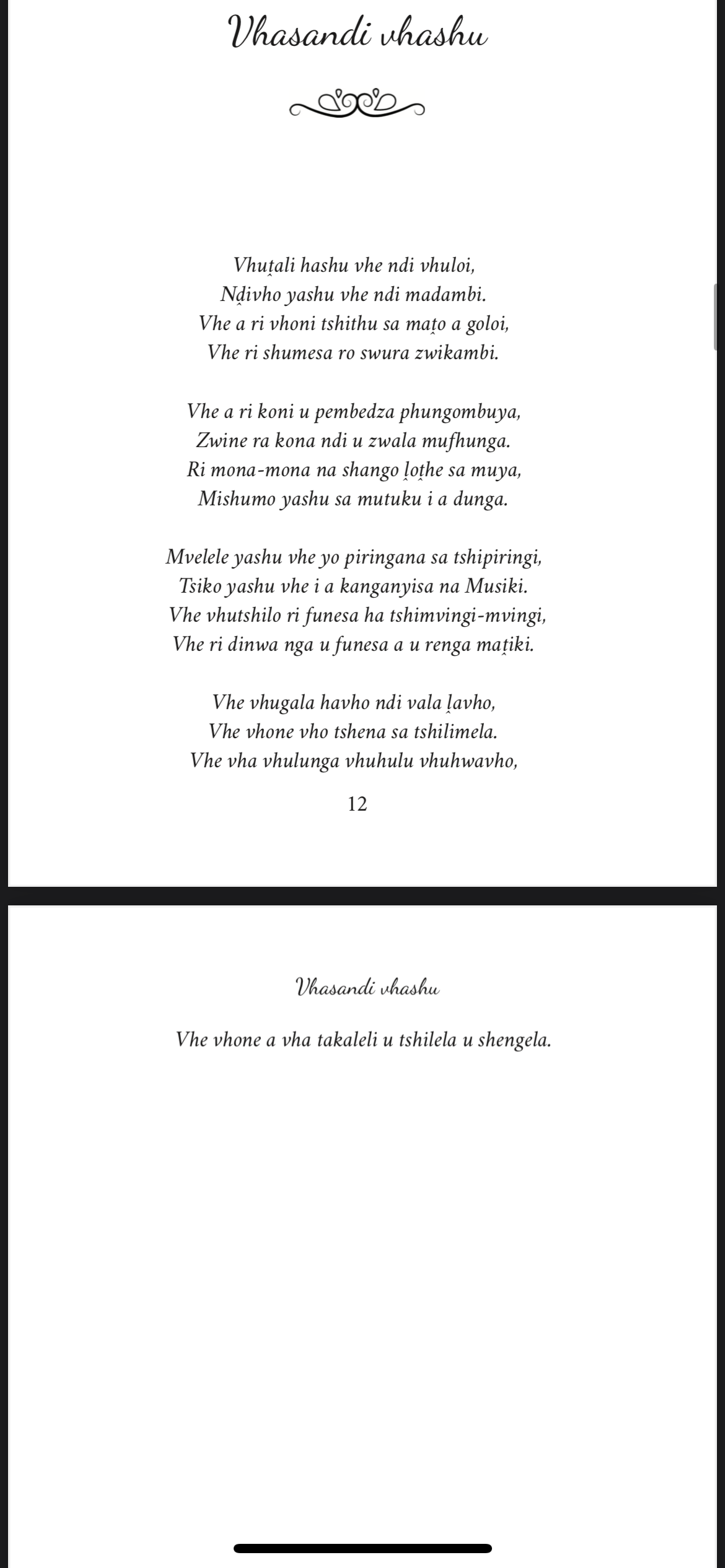 Hoyu mushumo wo thoma henengei Matongoni, tsikoni ya vhathu. Vhurendi vhu shumisa maipfi o teaho nyito iyi. Izwi zwa takadza ane a khou ralo u khoḓwa kana u rendwa, a pfa hu tshi tou vha makwanḓani.