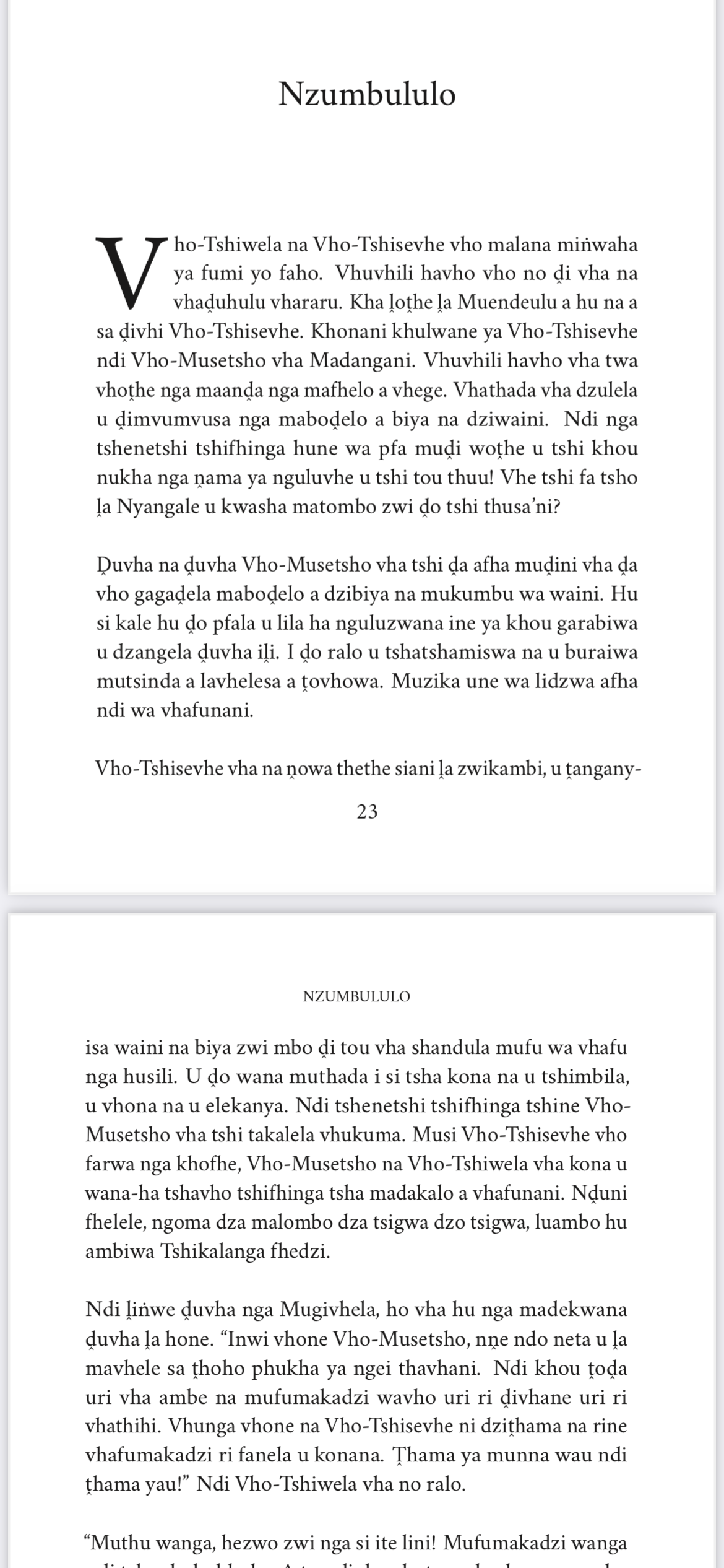 Tshivenḓa tsho shumiswaho kha bugu eyi tsho ṱamba tsha dovha tsha sedzuluswa nga vhaṅwe vhaṅwali makone. Kha vha ḓo pfa kusuvhele kwa luambo lwe Mudzimu wa Vhavenḓa Ṅwali a ri tonda ngalwo.