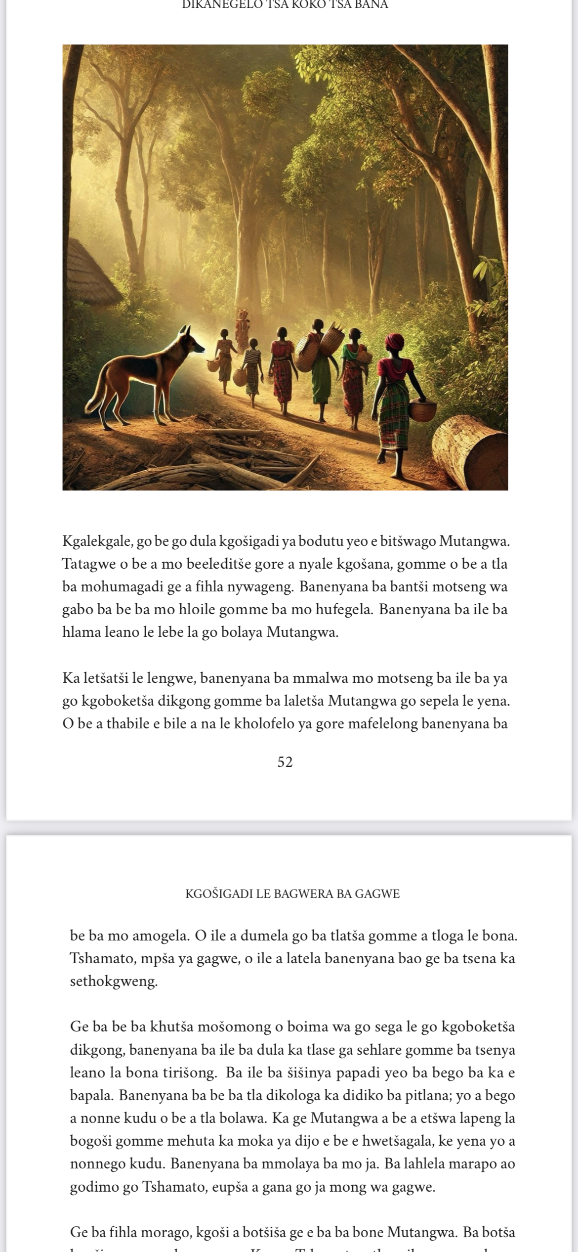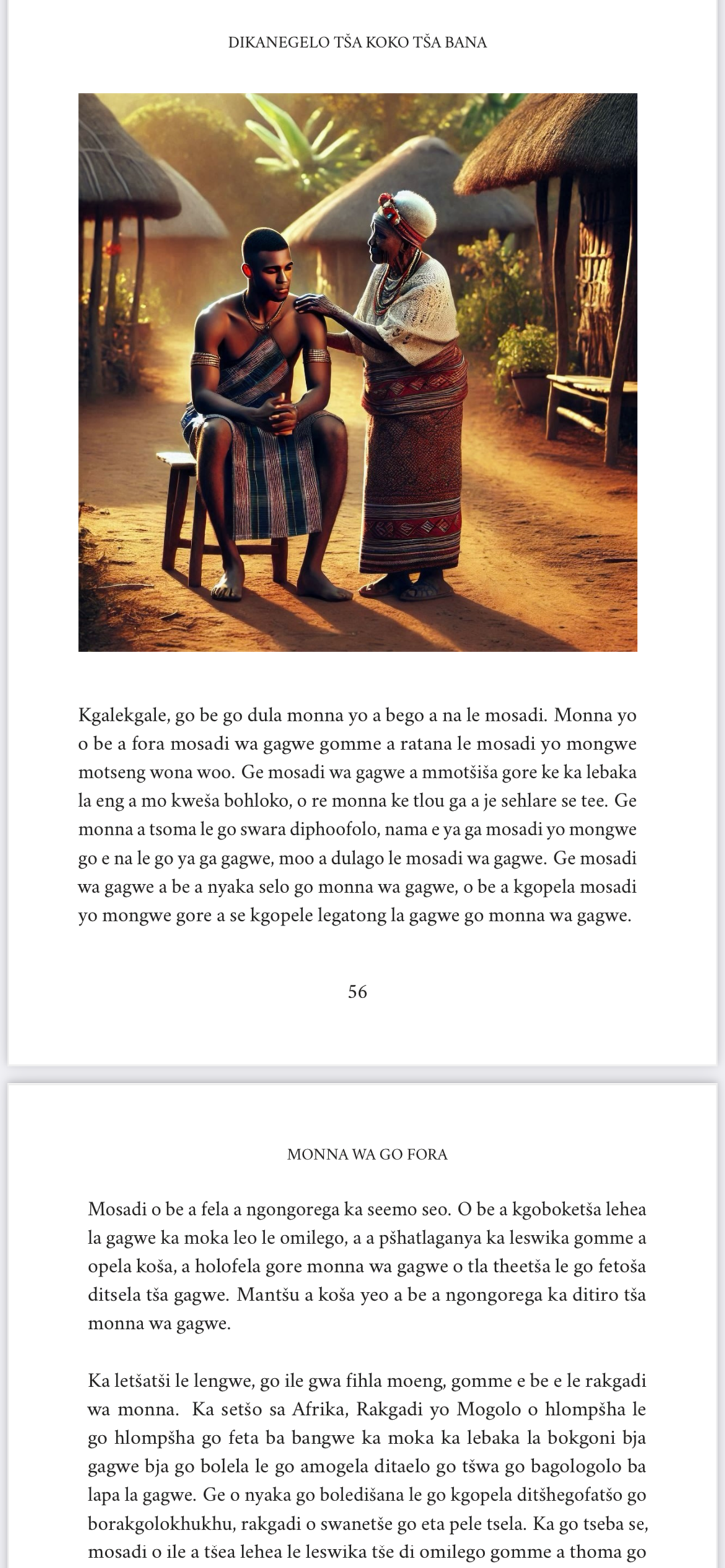 Ka kanegelong yeo e nago le sehlogo se se rego, “Ditšhiwana”. Re hwetša mma wa bobedi yo mobe a hufegela lerato leo monna wa gagwe yo mofsa a nago le lona go morwa wa gagwe gomme o tšea sephetho sa go mmolaya. Mma wa bobedi o tšea sephetho sa go tšhela mpholo dijong tša mošemane. Ka letšatši le lengwe, o ile a phegelela go tšea mediro ya go apea. Tiro ye ya sewelo ya go fa kudu e ile ya dira gore kgaetšedi ya mošemane e belaele. Ngwanenyana o ile a lebelela mmagwe wa bobedi ge a apea gomme a mmona a tsenya modu wo mohwibidu wo o nago le mpholo dijong tša ngwanabo. Go phološa bophelo bja ngwanabo, ngwanenyana o be a fetoga nonyana, a dula lekaleng la mohlare ka lešakeng la dikgomo ge ngwanabo a notlela dikgomo bošego, gomme a lemoša ngwanabo gore a se je poroto. Kanegelo ye e ruta ka ga lerato, potego le ka fao botse bo tlago fenya bobe ka mehla.