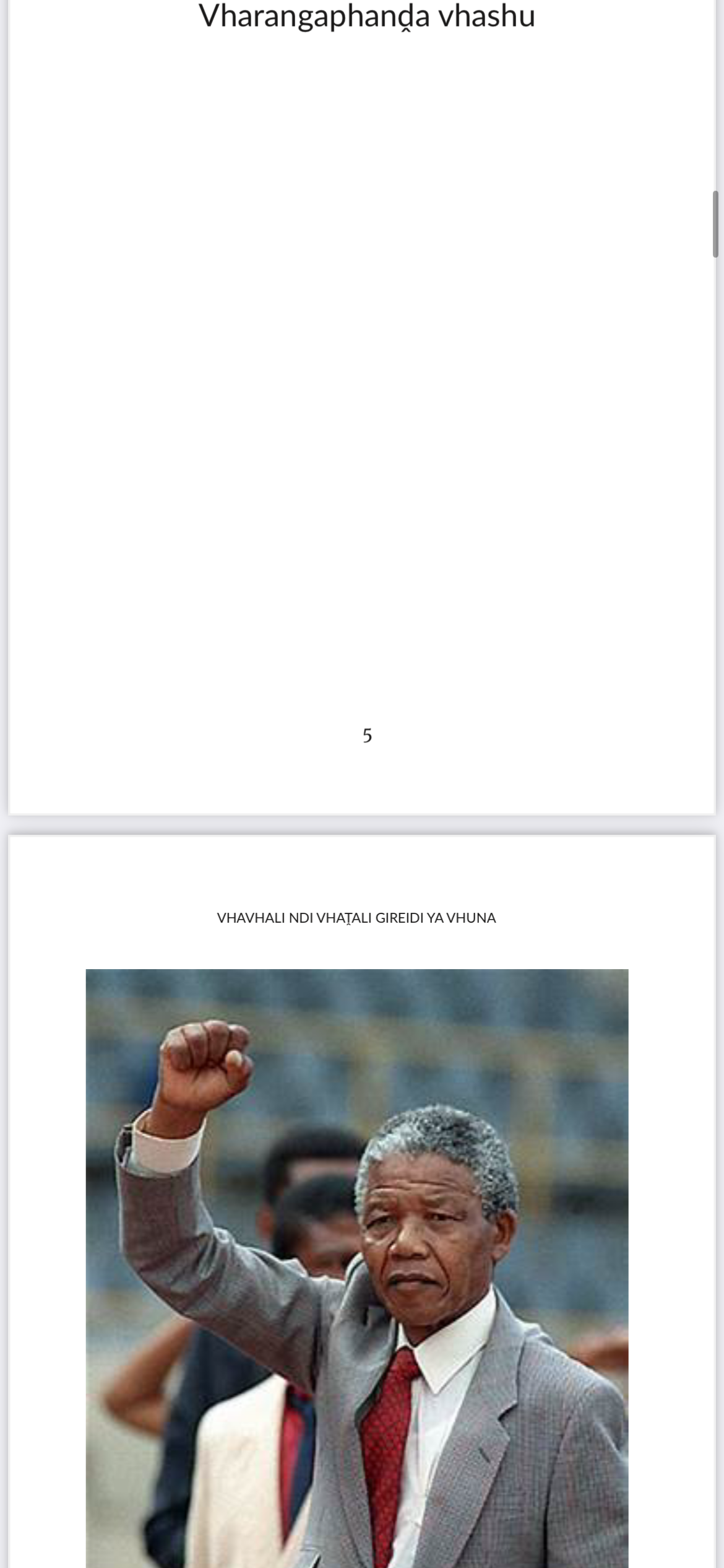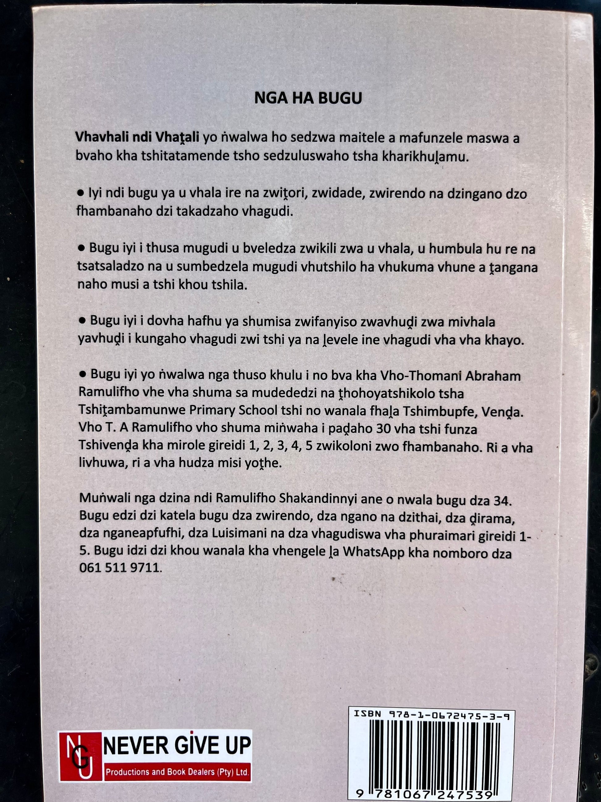 • Bugu iyi yo ṅwalwa nga thuso khulu i no bva kha Vho-Thomani Abraham Ramulifho vhe vha shuma sa mudededzi na ṱhohoyatshikolo tsha Tshiṱambamunwe Primary School tshi no wanala fhaḽa Tshimbupfe, Venḓa. Vho T. A Ramulifho vho shuma miṅwaha i paḓaho 30 vha tshi funza Tshivenḓa kha mirole gireidi 1, 2, 3, 4, 5 zwikoloni zwo fhambanaho. Ri a vha livhuwa, ri a vha hudza misi yoṱhe.