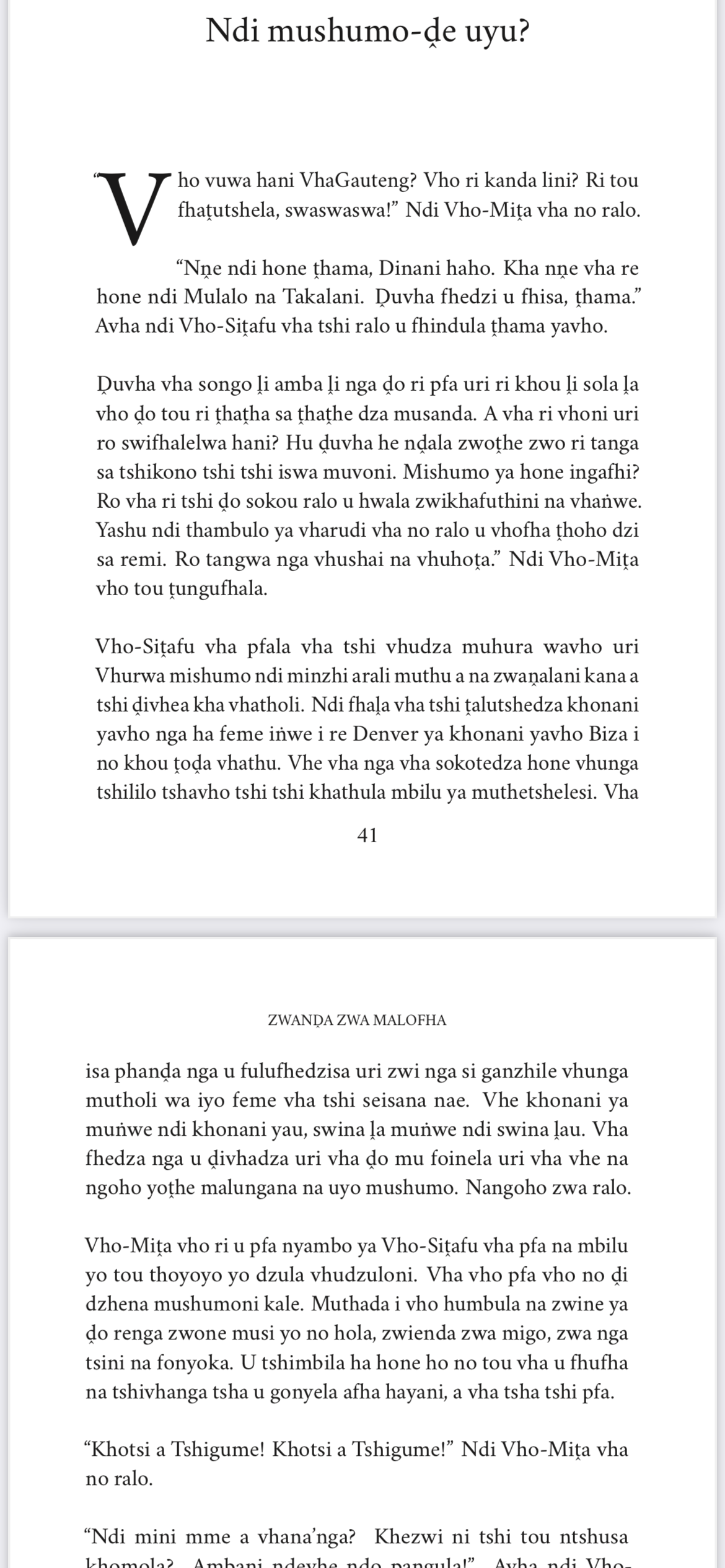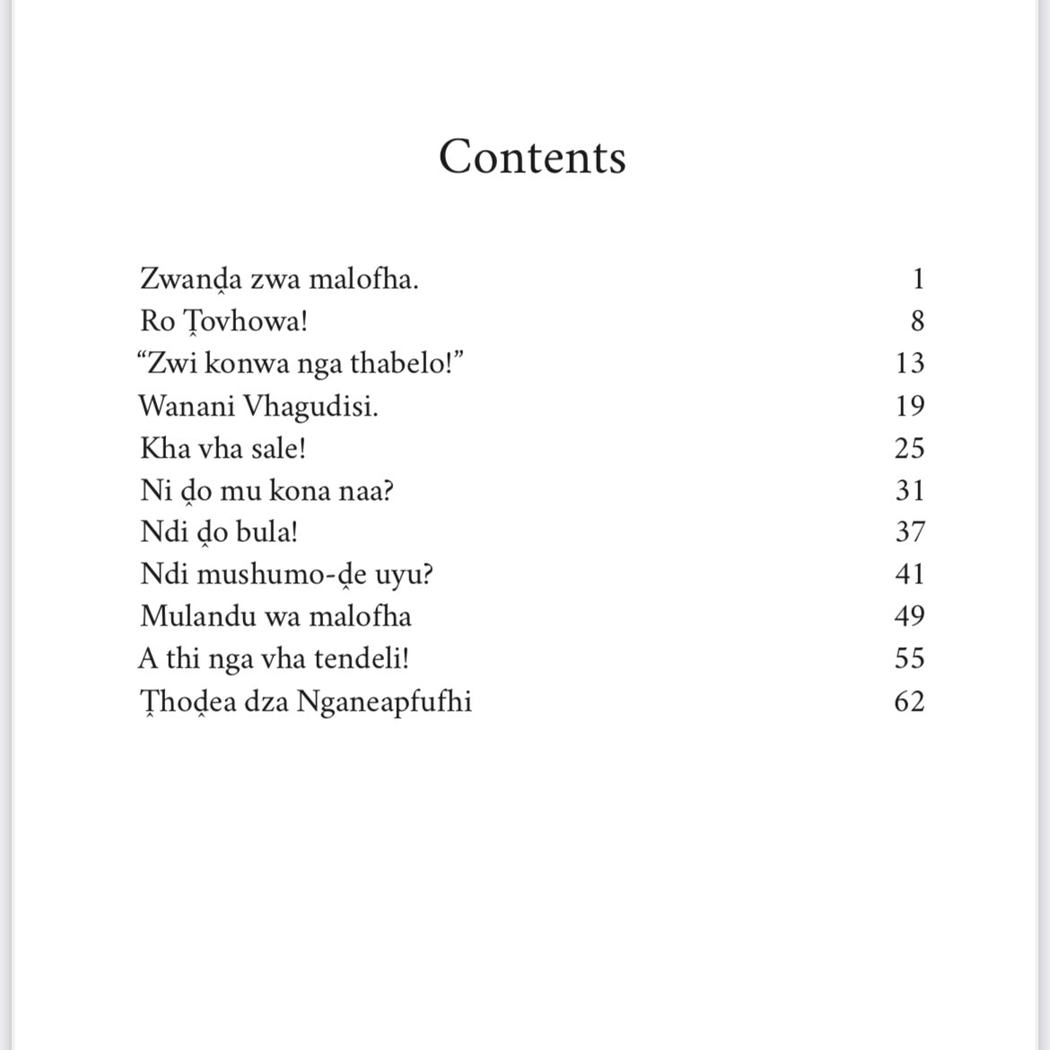 Sa muṅwali, mbilu yanga yo ruḽa ngauri ndi a zwi ḓivha zwauri mushumo uri nga ngomu ha bugu eyi ya ZWANḒA ZWA MALOFHA ndi wa maṱhakheni. Ndaa!
