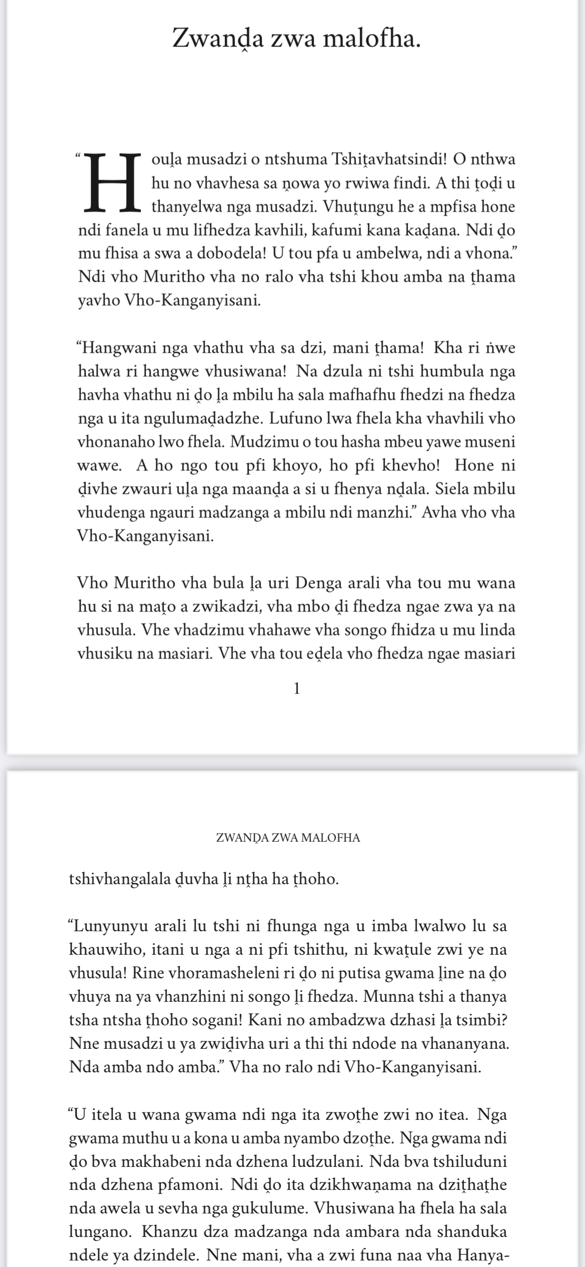 Tshivenḓa tsho shumiswaho kha bugu eyi tsho ṱamba tsha dovha tsha sedzuluswa nga vhaṅwe vhaṅwali makone. Kha vha ḓo pfa kusuvhele kwa luambo lwe Mudzimu wa Vhavenḓa Ṅwali a ri tonda ngalwo.